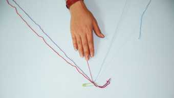 You make the bracelet by tying lots of small knots. This creates a pattern. You can have lines, zig-zags and even arrows! This is a type of weaving. Lots of artists use weaving to create their art.